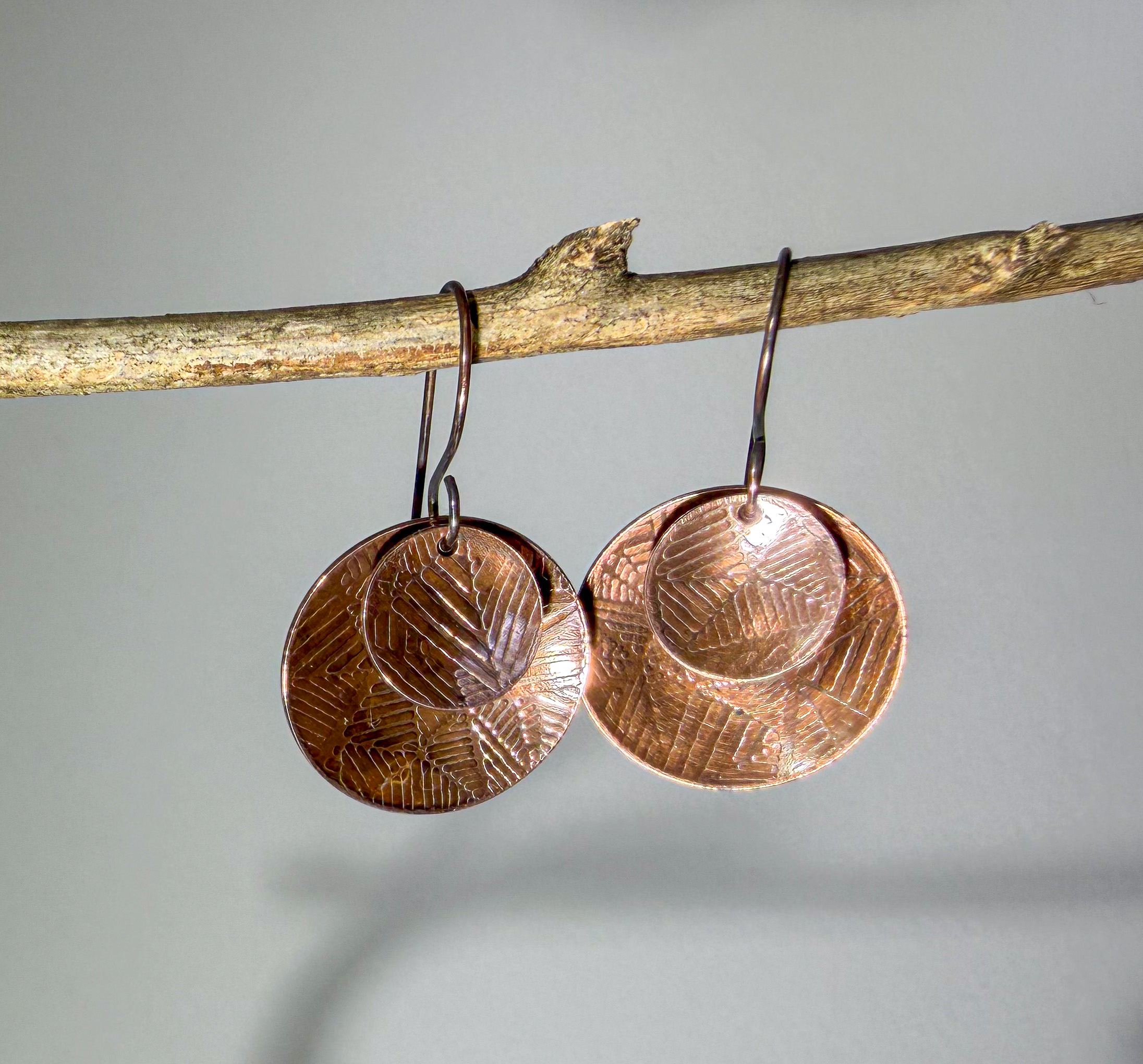 Home / Earrings / Copper Disc Earrings #388 Copper Disc Earrings #388$30.00 Copper discs, which have been textured, oxidized and polished Length from top of earring wire to bottom of earring is 1/18″” Width is 1″ 2 in stock Copper Disc Earrings #388 quantity Add to cart SKU: 388 Category: Earrings