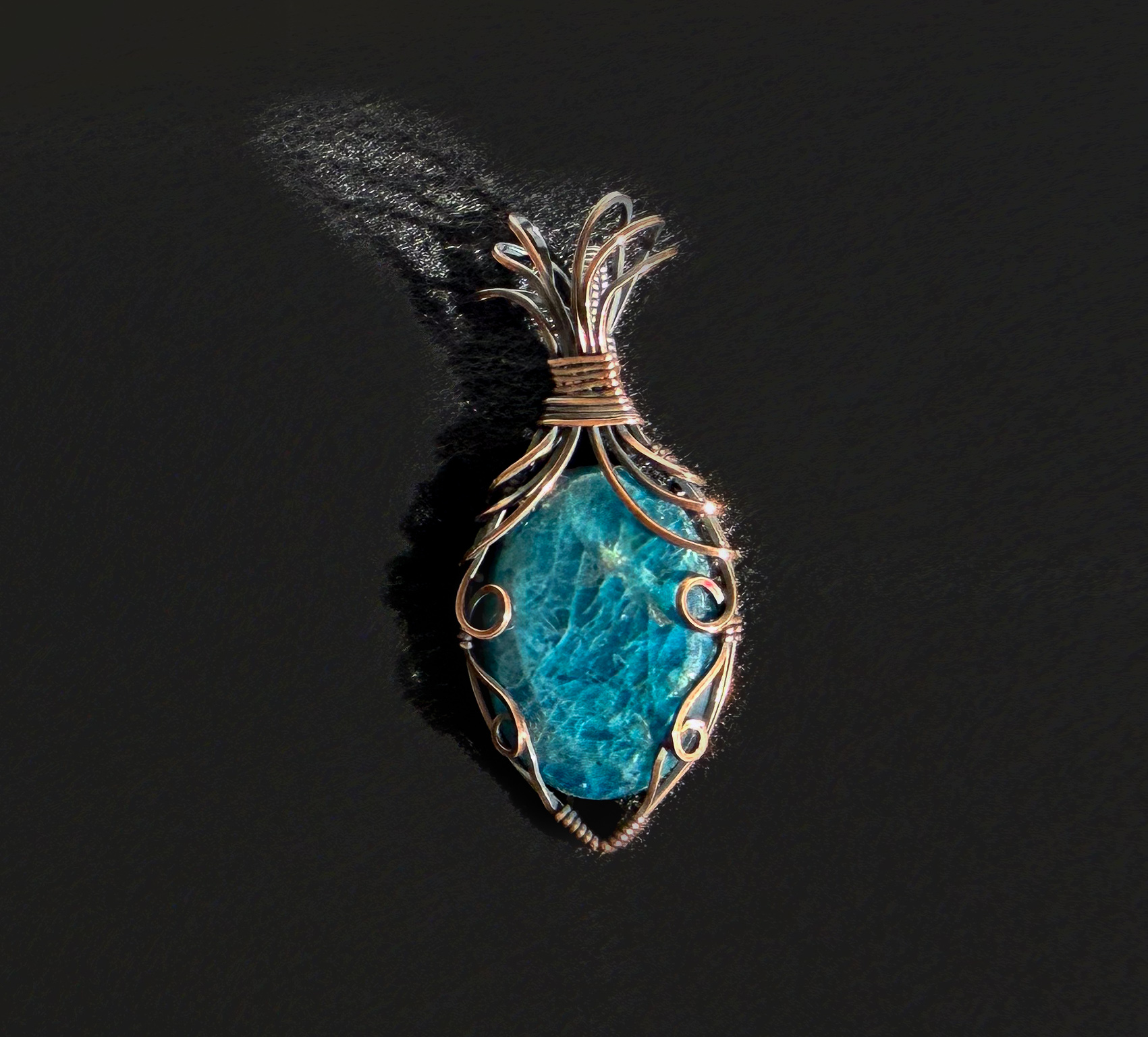 Home / Pendants / Apatite Stone Pendant #424 Apatite Stone Pendant #424$55.00 Apatite stone wrapped in copper Copper has been oxidized and polished Length from top of pendant is 2 1/4″ Width is 7/8″ All pendants come with a 20″ nylon cord Out of stock SKU: 424 Category: Pendants