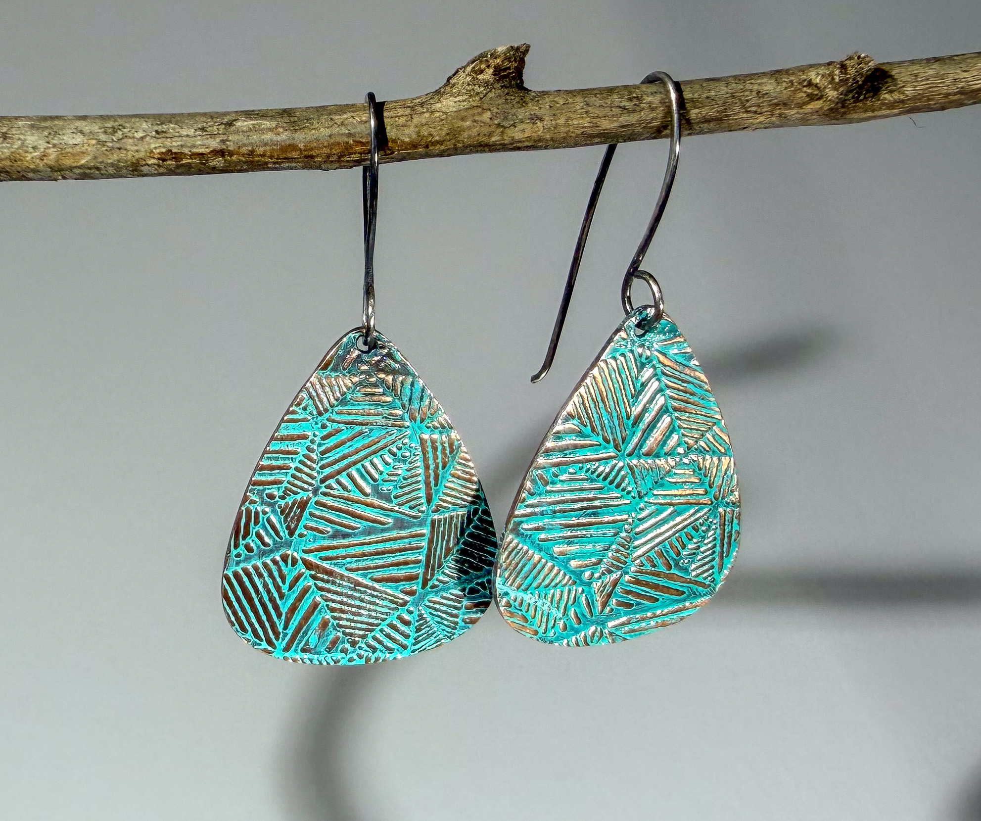 Copper Textured Earrings- Teardrop Shaped with Turquoise Patina #224